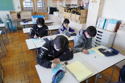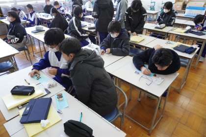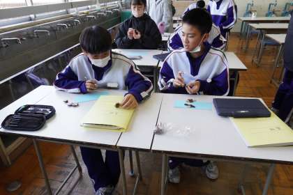 寄せ木のアクセサリーが完成しました。台紙に自分の作品についてコメントを記入しました。