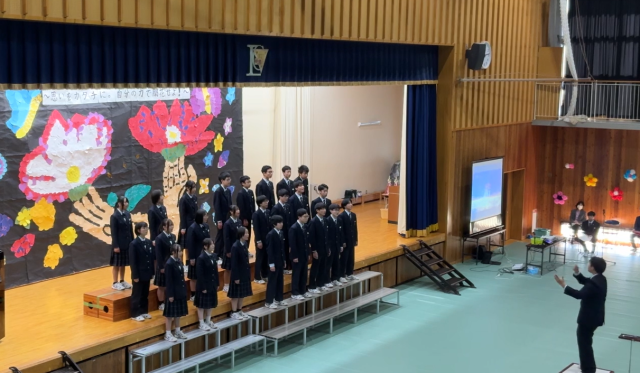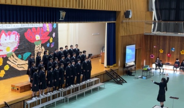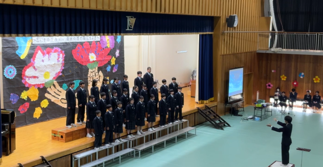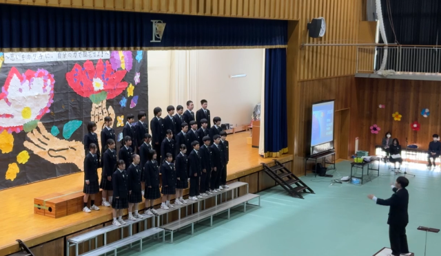 午前は校内合唱コンクールが行われました。どのクラスもさまざまな困難を乗り越え、この日に向けて一生懸命に練習に取り組んできました。その成果を発揮し、素晴らしいハーモニーを聴かせてくれました。写真は上から各学年最優秀賞に輝いた、1年2組、2年2組、3年2組と、3学年優秀賞の3年5組の合唱の様子です。なお、3年2組と3年5組は、11月13日(木)に市文化センターで行われる中学校音楽学習発表会に明健中学校代表として出場します。