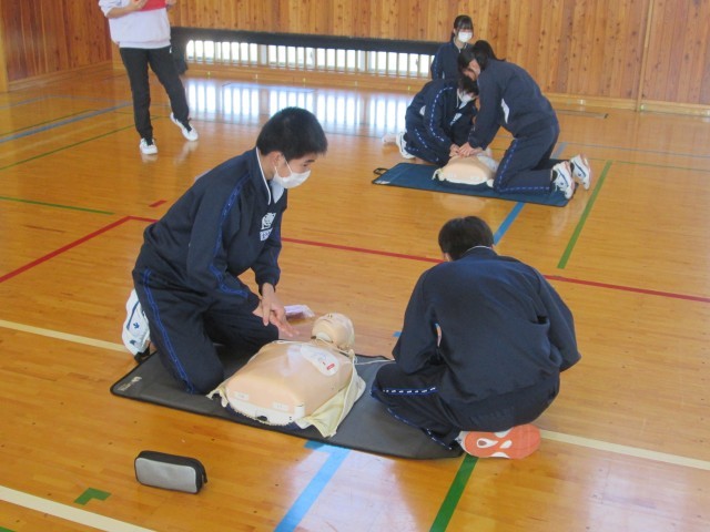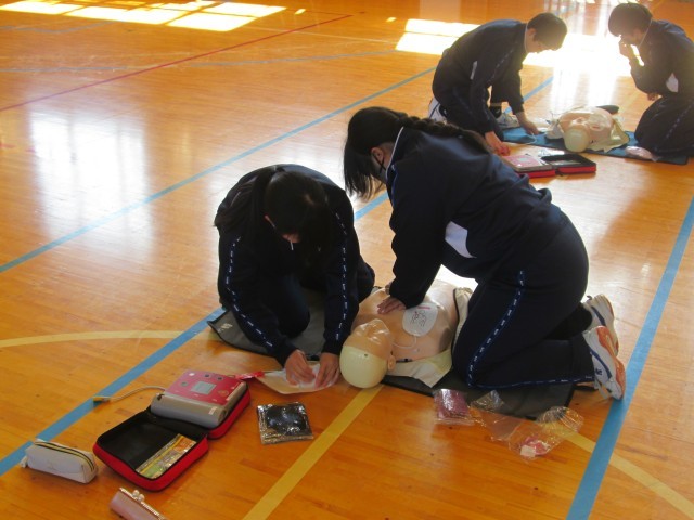 最初に心肺蘇生法について講義を受け、その後グループごとにダミー人形を使って心臓マッサージや人工呼吸、AEDの使い方について体験を行いました。