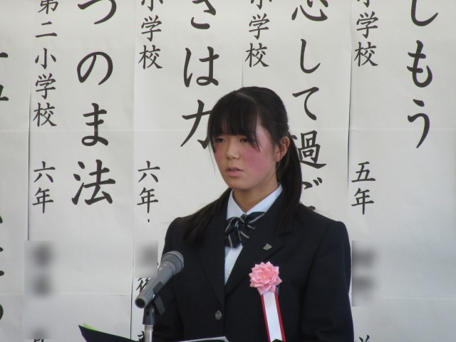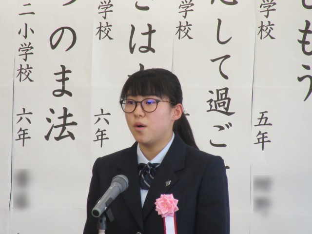 本校からは1年生の生徒が「小さな命の協力」、2年生の生徒が「旅が教えてくれたこと」をテーマに地域の方々に堂々と自分の考えを発表しました。