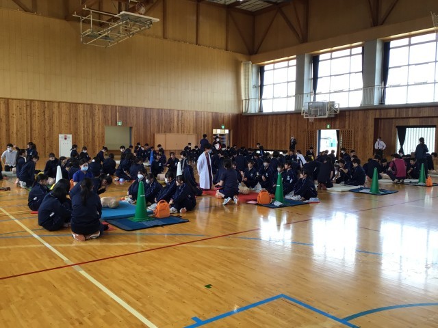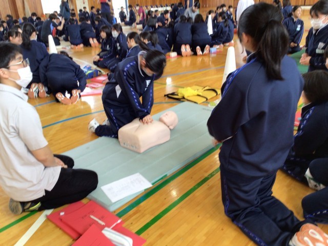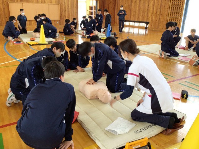 郡山医師会による救急蘇生法を2年生が受講しました。救急蘇生の方法について、模範指導を受けた後、胸骨圧迫や人工呼吸等を行いました。真剣に取り組んでおり、講師の先生から、「多くの生徒が胸骨圧迫ができており感心しました。」とのお褒めの言葉をいただきました。そのような場面に遭遇したとき、今回の講習が役に立ち、人の命を救う行動が取れることを願っています。