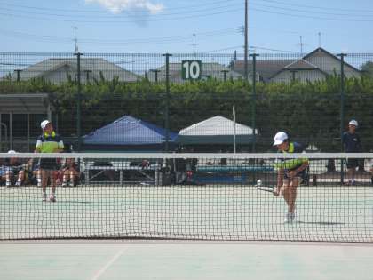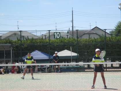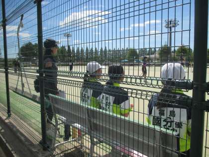団体戦の試合の進め方を研修し、実際の試合を行った女子ソフトテニス部。ペアで協力して円滑に試合を進めていました。予選リーグDブロック5校と対戦し、第1位で決勝リーグへ進出。決勝リーグでは、第1ペアが引き分け、第2ペアが勝利。ここで4時30分を過ぎ大会終了となりました。第3ペアまで試合をすることができませんでしたが、暫定1位。猛暑に負けず、最後まで1日戦い抜いた1年生に大きな拍手です。おめでとうございます。