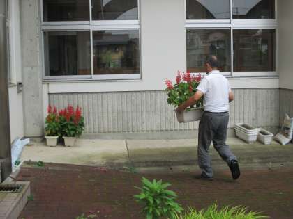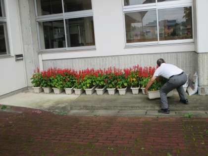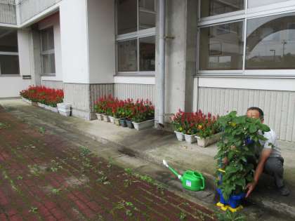 14日は、気圧の谷や湿った空気の影響により、曇りで雨の降る予報です。中通りでは昼過ぎから雷を伴い激しく降る見込み。15日は、台風第10号が西日本へ北上し、暖かく湿った空気が流れ込むため、中通りは曇りで、夕方から雨の降る所がある予報。台風に備えて、毎日水やりをしている佐藤先生が草花たちを避難させました。台風とともに、高温が予想されるため、熱中症にも引き続き注意し、残りの夏休みを充実させてください。
