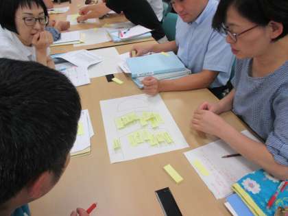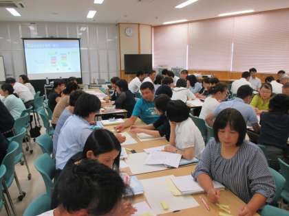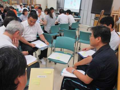 そもそも「考える」って何か?自分の言葉で書き出した先生方。泰山先生から学習指導要領や小中学校の全教科書から、「考える」ことについて19の「思考スキル」に分類されたことを説明していただき、その意義をあらためて確認しました。「何を知っているか」から「何ができるようになるか」について「思考ツール」を具体的に使って小グループで演習しました。今回の研修を授業の質的改善のために活用し、「考えることが楽しい授業」を目指して取り組んでいきたいと思います。泰山先生、示唆に富む貴重なお話ありがとうございました。