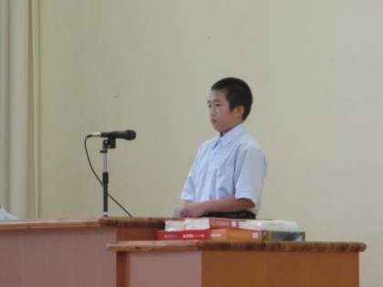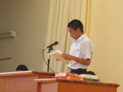 始業式で学年代表として2学期の目標を発表した1年水口君、2年秋田君、3年橋本君。1学期の反省を生かし、2学期に学習や生活面で努力することを具体的に発表しました。学校行事で学級の団結力を高めること、互いに切磋琢磨すること、一人一人の自覚で学校をよりよくすることなど抱負が述べられました。全校生で充実した2学期にしたいです。
