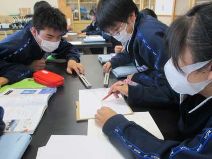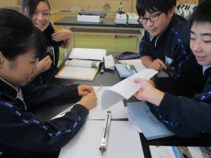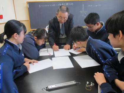 3年生は理科の時間、2力のつり合いや力の合成と分解について、バネを使って実験をしました。バネの目盛りを読み取り、どんな力が働いているか班ごとに考えました。