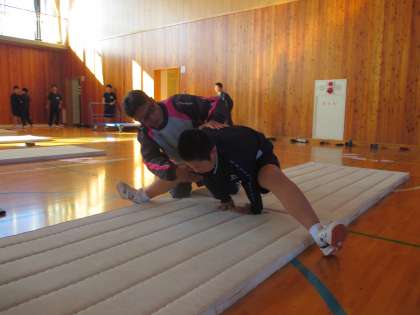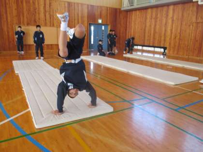 マット運動に真剣に取り組む1年生。立から立ち上がる時は、右手でマットを押しながら立ち上が、膝が曲がる場合は開脚を意識、できない人は膝を曲げて小さく回る練習から、などコツを先生や仲間に教えてもらいながら頑張っていました。