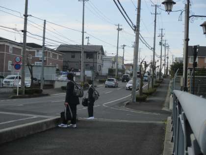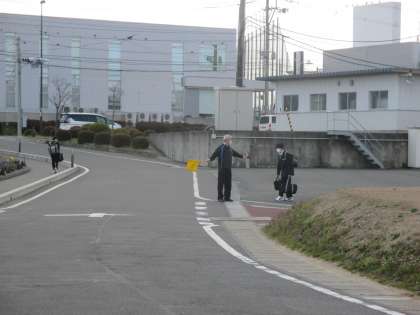 通学路には、歩道の狭い所や横断歩道・信号のない所、視界が悪く道幅もとても狭い所など危険な箇所がたくさんあります。春の交通安全指導で先生がたが3カ所に立って、登校状況を確認しました。特に、朝の通勤で車が混雑する時間に、横断歩道のないところを渡るのは危険です。状況によるところもありますが、少し歩く距離がのびても横断歩道を渡りましょう。