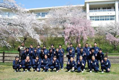 4月8日、地域清掃活動を終え、2年3組クラス記念写真。春の日差しに輝く満開の桜の下、笑顔もキラキラで、春爛漫です!