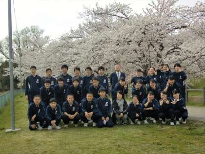 4月8日、地域清掃活動を終え、3年3組クラス記念写真。春の日差しに輝く満開の桜の下、笑顔もキラキラで、春爛漫です!