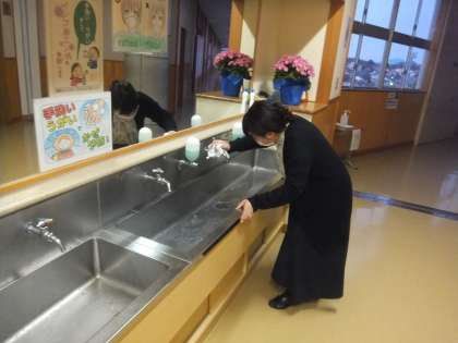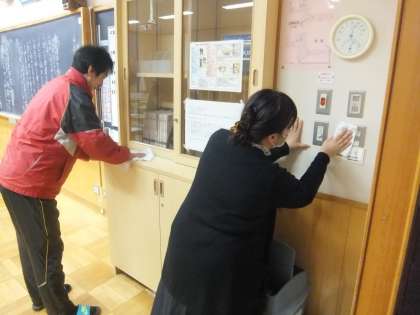 生徒の皆さんの完全下校を確認し、教室・校舎内を消毒しました。多くの生徒の手を触れる箇所、机・椅子、水飲み場、トイレ等、消毒液を使用して清掃しました。