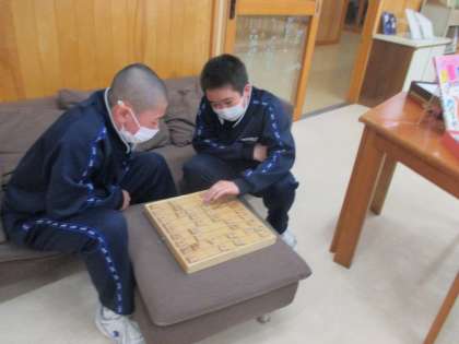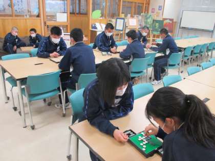 冷たい雨に桜が散り始めています。あいにくの雨で昼休みは、屋内で工夫して過ごしました。2年生の中には、図書館で、将棋、碁、オセロに興じる人もいました。