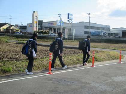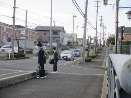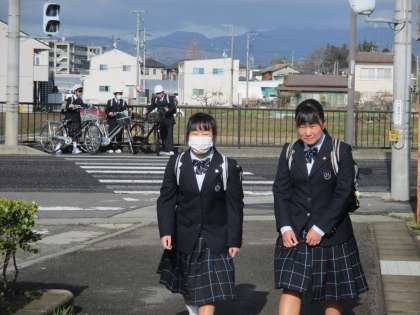新学期が始まって1週間。ほとんどの生徒の皆さんは、交通ルールを守っての登校ですが、自宅付近の慣れた道でも油断せず、左右の安全を確認して横断することが大切。交通量の多い狭い通学路ですから、小学生とすれ違うときや車の往来するときは、必ず一列で歩きましょう。車が混雑する朝の時間帯ですから、横断歩道があるところを渡るようにしましょう。