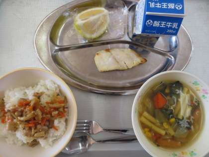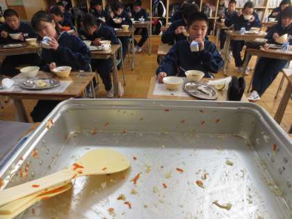3学期初めての給食は、「チキンガーリックピラフ、牛乳、白身魚のチーズマヨネーズ焼き、カレーコンソメスープ、はるか」。多くの人々に支えていただいて口にすることができる給食に、感謝の心できれいにいただきました。おいしい給食ごちそうさまでした。