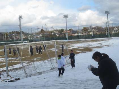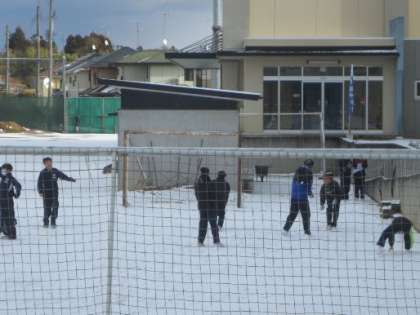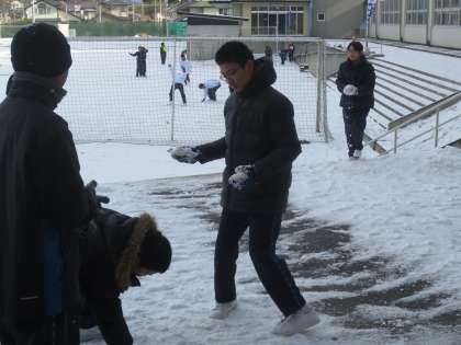 校舎の陰なって残っていた校庭の残雪をめざして昼休み飛び出してきた生徒の皆さん。雪遊びで盛り上がっていました。身体にしみ入る寒さの中、やはり子供は「風の子」です。