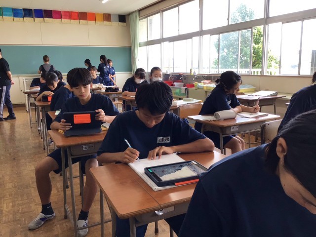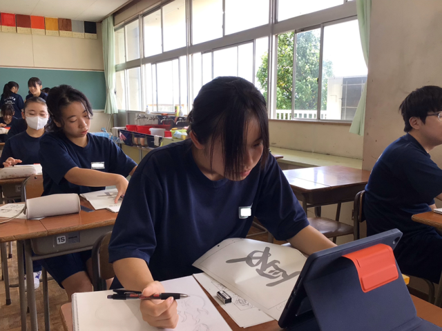 2年生は美術で絵刻字に取り組んでいます。自分の好きな漢字一文字を選び、その漢字にデザインを付けていきます。「夏」「勝」「魂」など様々な漢字を選び、真剣に取り組んでいました。