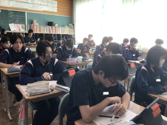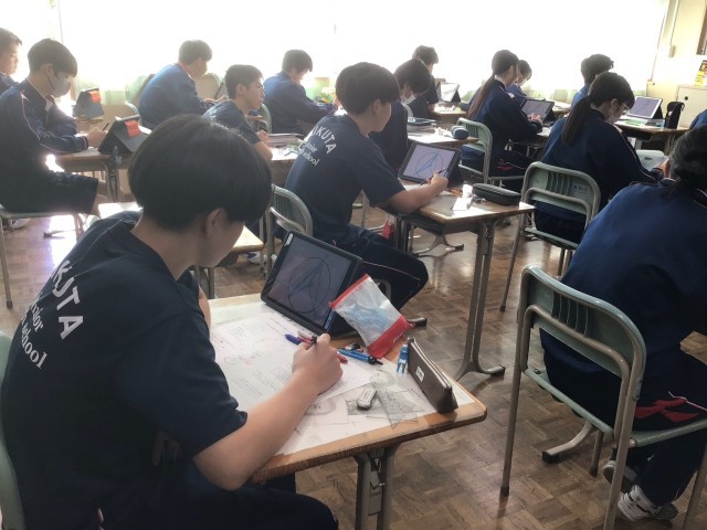 3年生は数学で円周角について学習しています。今日は円周角の角度の求め方について学びました。円周角は中心角の2分の1になるという定理を使って、二等辺三角形の角度を求めました。角度を求める問題は、入試などにも出てきます。今日の授業の内容をしっかりと覚えましょう。