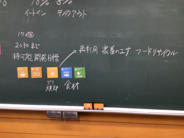 あおぞら学級では、数学の授業においてお弁当の割引の計算を行う中で、SDGsとの関連を考えどのようなつながりがあるのかをまとめました。特に、7「エネルギーをみんなに そしてクリーンに」に関連して、廃棄される食材を家畜のえさとして再利用するフードリサイクルができるのではないかとの意見が出ました。素晴らしい発想だと感心しました。