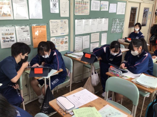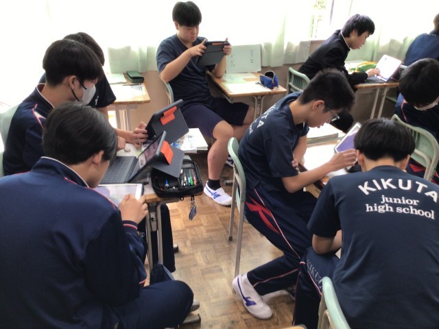 3年生の技術では、タブレット端末を利用して、サーバとの通信を学習しました。フローチャートをもとにプログラムを組みサーバとの通信に取り組んでいました。