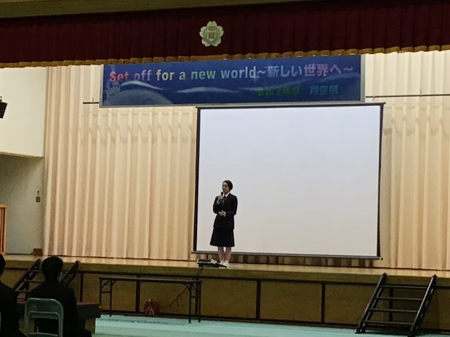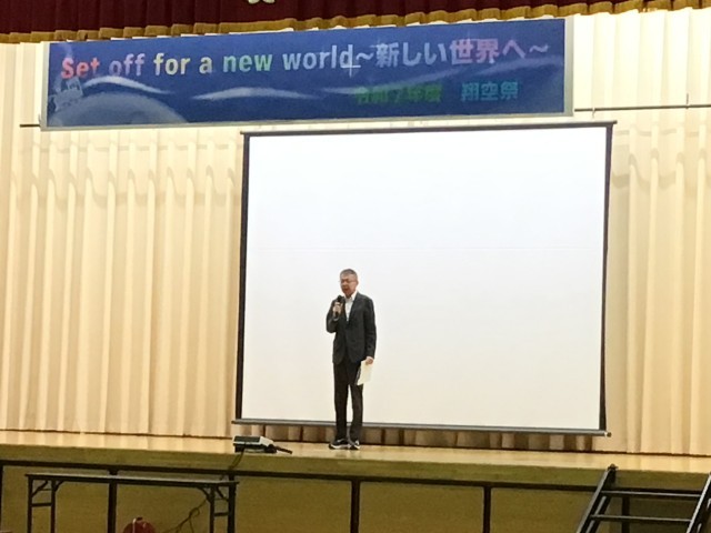 Set off for a new world〜新しい世界へ〜のテーマのもと、翔空祭が始まりました。オープニングセレモニーでは、実行委員長あいさつ、校長あいさつのあと、テーマへの思い、テーマ看板への思いを伝えました。