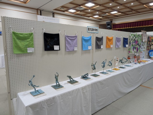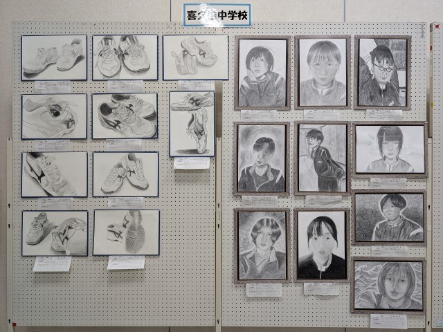 全学年の書写、1年生のシューズのデッサン、2年生の立体像と刺し子のきんちゃく袋、3年生の自画像が展示してあります。