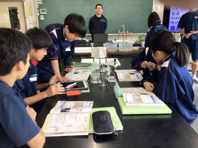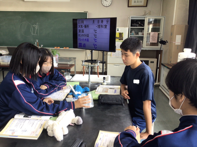 露点とは、気体を冷やしていったときに結露が始まる温度のことです。空気中に含まれている水蒸気の割合が少なければ露点は低く、水蒸気が多ければ露点は高くなります。つまり、露点は空気中の水蒸気量を数値化したものであり、湿度と同じようなものを表しています。2年生は理科室で露点の測定を行いました。班で協力し、データを集めることができました。これから冬になり結露が多く見られる時期になります。結露のでき方が理解できたと思います。
