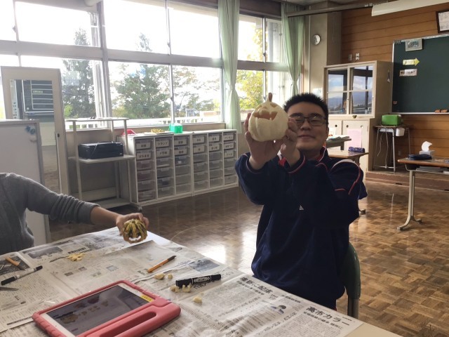 あおぞら学級ではかぼちゃをくり抜きハロウィンの飾りを作製しました。かぼちゃのくり抜きは手間のかかる作業でした。今日は顔の部分を丁寧に作る作業をしました。完成が楽しみです。