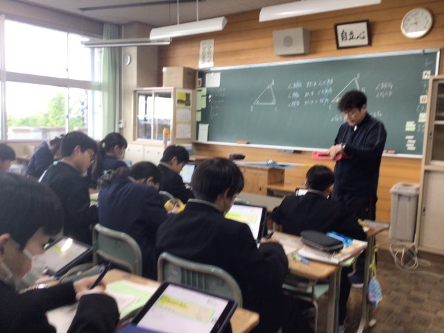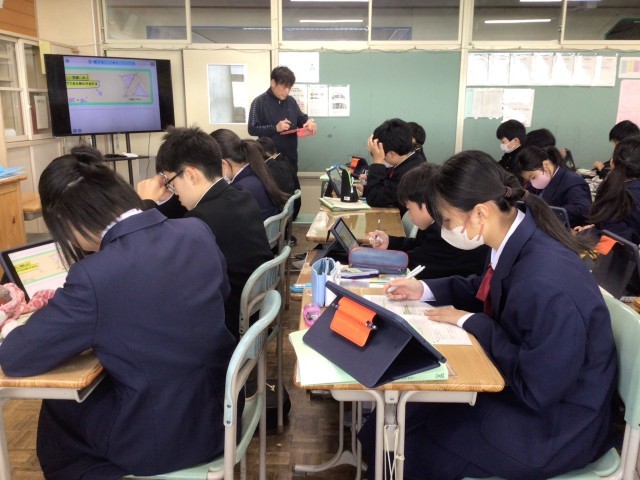 1年生の数学では図形を学んでいます。今日は三角形を回転移動させるための学習を行いました。説明を聞いて、その後、点Oを中心に反時計回りに移動させました。タブレット端末を使いながら、やり方を確認していました。
