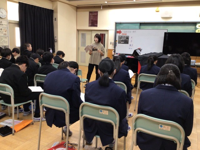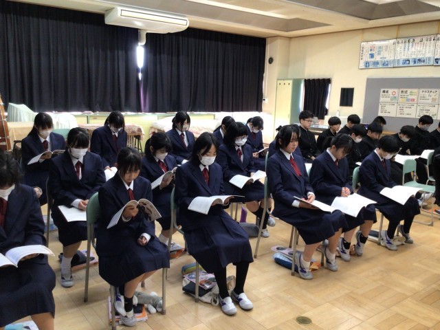 1年生の音楽では、魔王の鑑賞を行いました。ドイツ語の曲を聴いた後、日本語訳や魔王の曲のつくりについて学び、日本語での曲を聴きました。楽譜を見ながら真剣に曲を聴いており、曲の特徴や内容についての理解が深まりました。