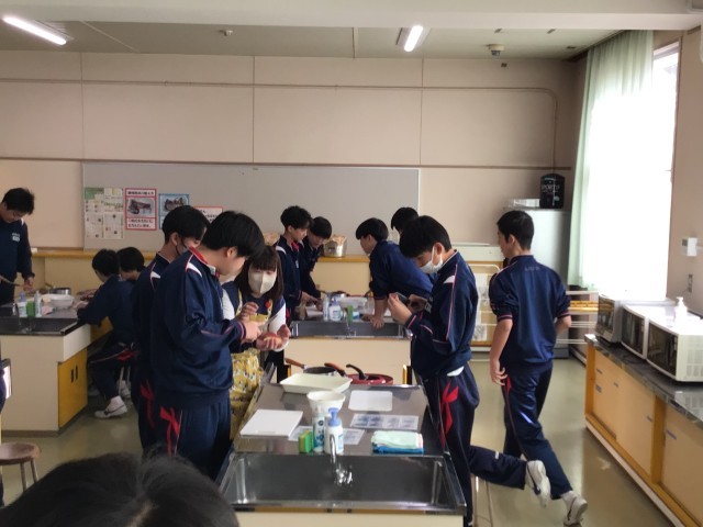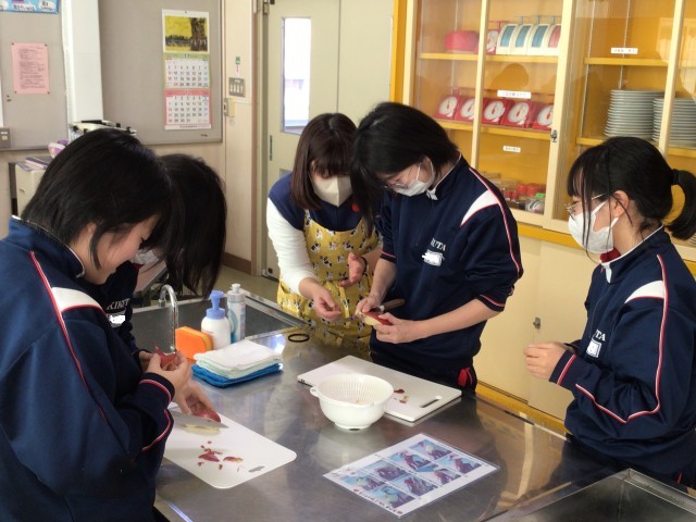 幼児のおやつについて学習した後、リンゴを包丁で加工し、ウサギの耳をつくりました。手順の画像をを参考にしながら、真剣に取り組んでいました。