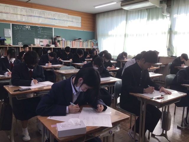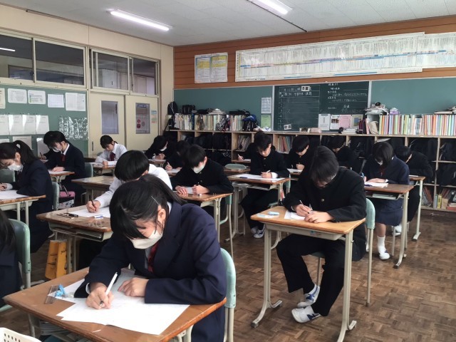 本日、3年生で実力テストを実施しています。写真は数学のテスト時の様子です。真剣に問題に取り組んでいます。