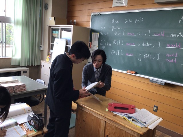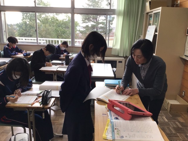 3年生の英語では、If I were ~ , I could(would)~(もし私が~だったら、~のに)の用法を用いて文を作成し、担当教師に確認してもらっていました。さまざまな場面を想像しながら表現していました。多くの文を作成することで使いこなしてほしいと思います。