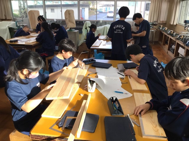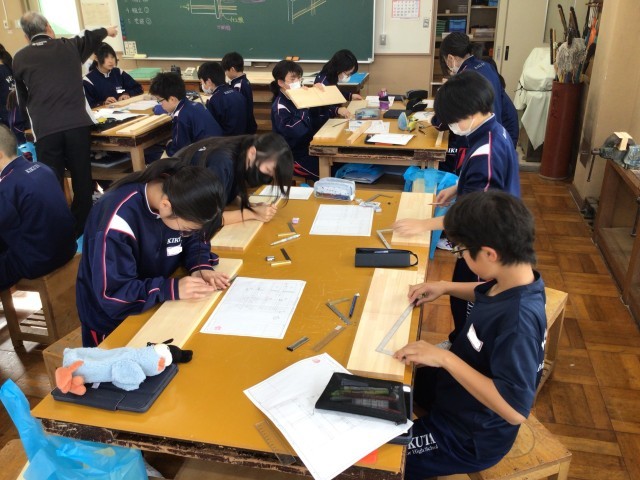 1年生の技術では、木製ラックの製作を行っています。製図したものを木の板に書き写す「けがき」を行いました。さしがねなどを使いながら正確に線を引いていました。どのようなラックになるのでしょう。今から楽しみです。