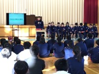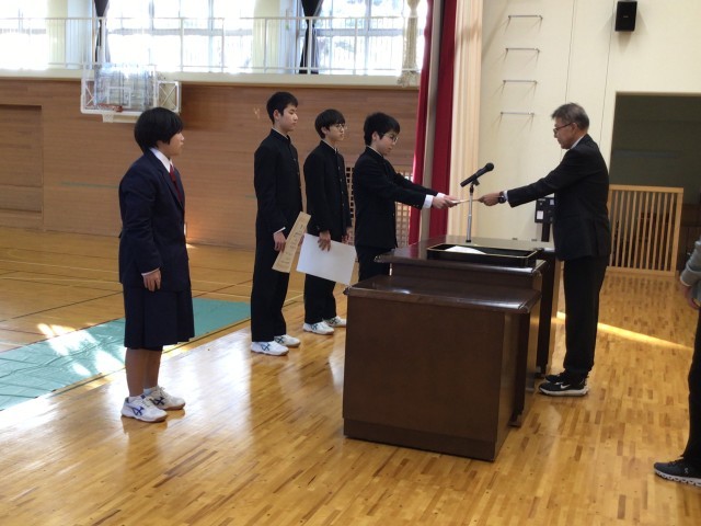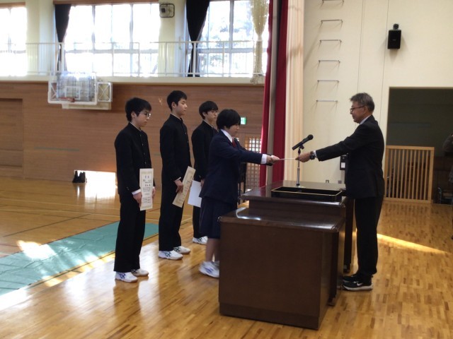全校集会を行いました。まず、県中地区バドミントン大会ダブルス「3位」、交通安全ポスター及び作文展 作文の部「優秀」、市中学生生徒造形展「特選」を受賞した生徒への表彰を行いました。おめでとうございます。