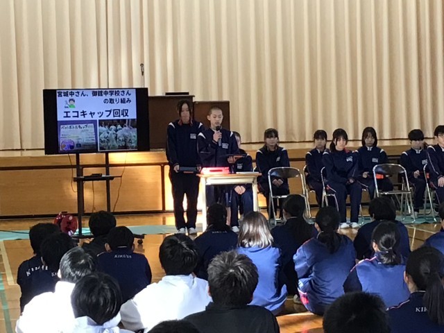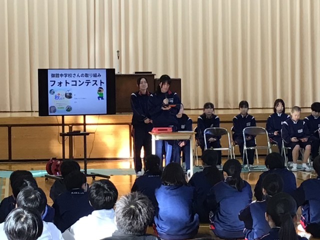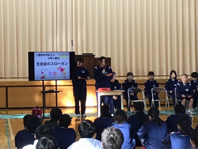 表彰のあとは、生徒会役員から生徒会交歓会の参加報告がありました。会の内容や他校での取り組みなどを発表しました。12月に今後の生徒会の活動テーマを全校生から募集し決定することも発表されました。