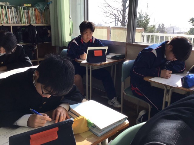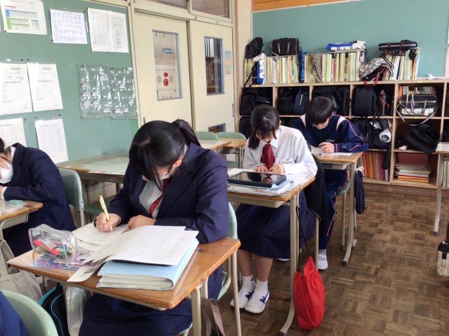 3年生は三平方の定理を使って解く問題に挑戦しました。教師から出題された問題に真剣に取り組んでいました。ただかつかつと鉛筆の音が響く教室でした。