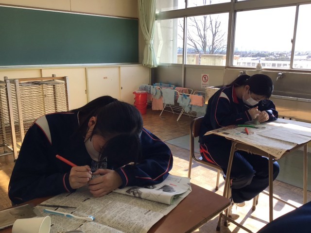 3年生は美術で篆刻に取り組んでいます。篆刻のデザインとして自分の名前の漢字や好きなキャラクターを下書きしたものを印にするために集中して作業に取り組みました。中学校最後の美術の課題です。よい作品に仕上げてほしいと思います。