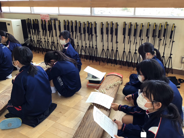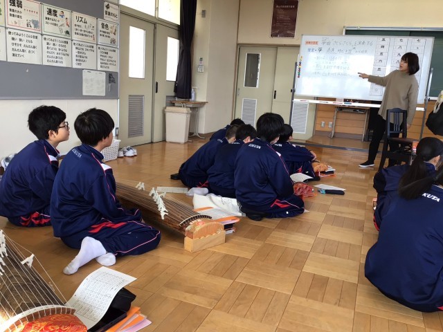 1年生は音楽で箏を演奏しました。教師のさくらさくらの模範演奏を聞き、その後、実際に箏に触れ、音を出しました。練習を重ねて、一曲弾けるようになるといいですね。