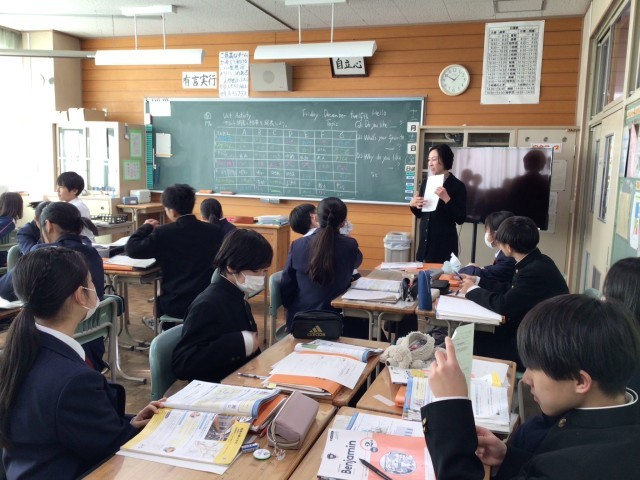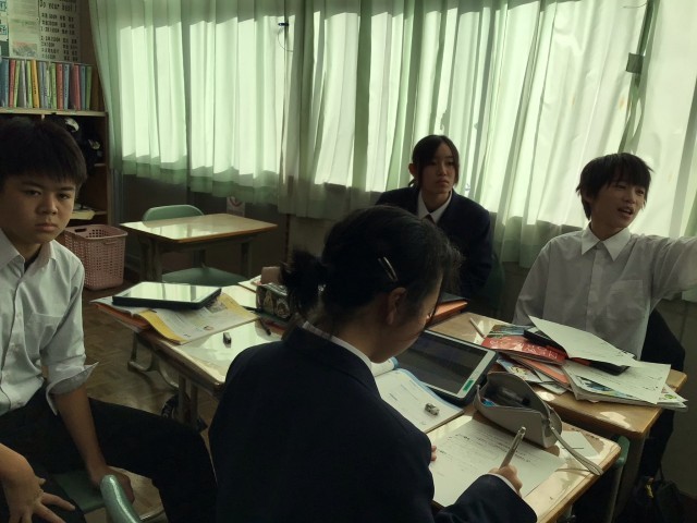 2年生の英語の授業では先日行ったアンケート調査の結果の発表を英語で行いました。班の中でそれぞれ調査項目を決め、調べた調査結果を各班に英語で伝えました。英語で伝えるので簡単ではありませんでしたが、身振り手振りも使って一生懸命に発表していました。