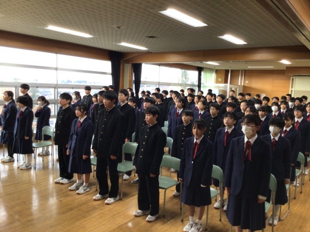 本日、第3学期始業式を行い、3学期がスタートしました。始業式では、生徒会代表生徒が、冬休みの反省と今後の抱負を述べ、校歌を大きな声で歌いました。また、JA共済の県書道コンクールの表彰を行いました。3年生が44日、1,2年生が49日の短い学期となりますが、3年生は、3年間のまとめと進路実現、卒業に向けての日々となり、1,2年生は、それぞれの学年のまとめと進級に向けた日々となります。1日1日を充実させ、実りある学期となることを願っています。
