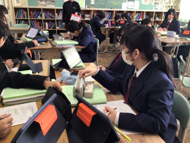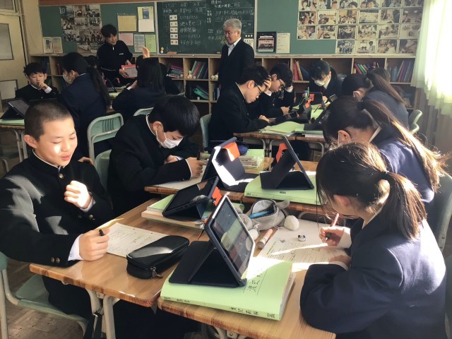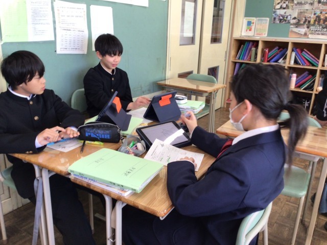 1年生の数学は立体図形の問題をグループになってみんなで考えました。一人一人が自分の知恵をみんなに伝え、全員が理解できるまで教え合いました。身を乗り出して教える姿も見られ、とても意欲が感じられました。