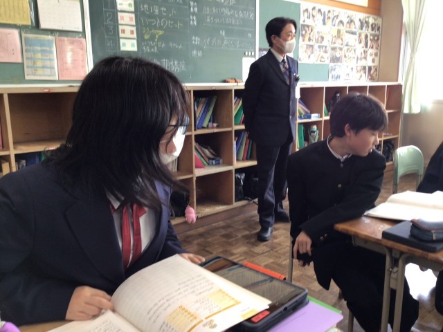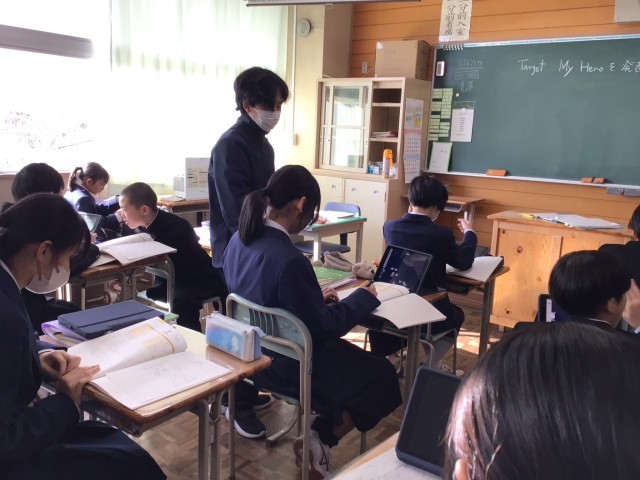 1年生の英語はマイヒーロー発表に向けて準備を行いました。アニメの登場人物、ユーチューバー、自分の家族など自分が思うヒーローを友だちに紹介するために英文を作ってきました。本日は学校教育アドバイザーにも授業を参観していただき、活発に学習する1年生をほめていただきました。