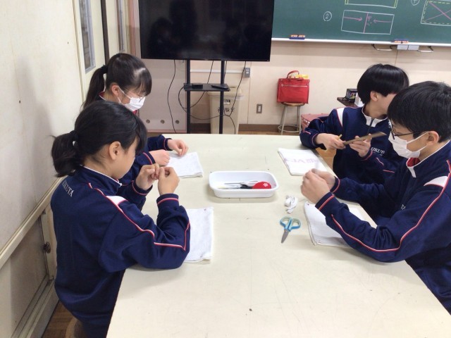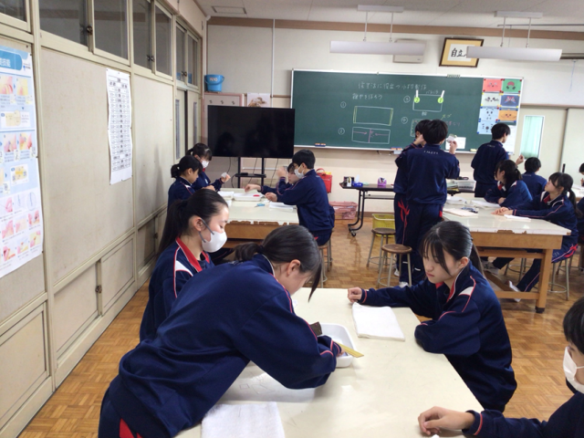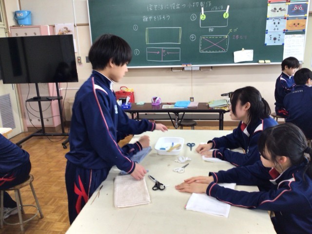 2年生の家庭科では雑巾を縫う作業を行いました。タオルを4つに折った厚い生地なので縫うのも一苦労です。それでも作業に集中して取り組む姿が見られました。