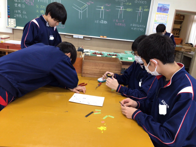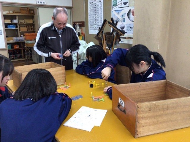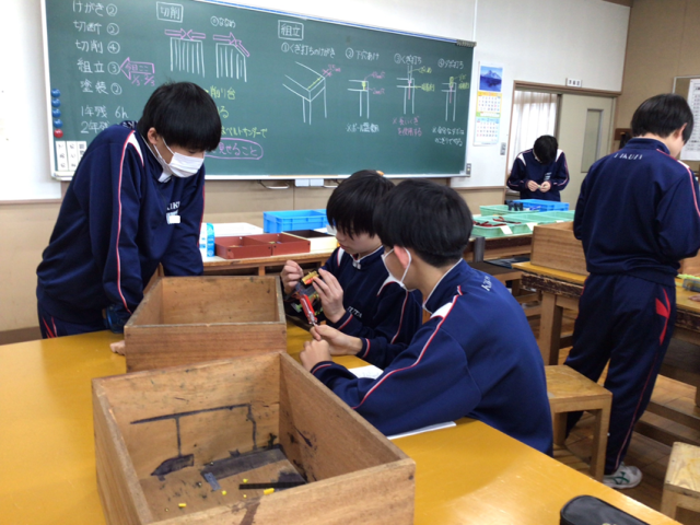 2年生の技術では電池を入れると動くおもちゃを製作しています。細かい部品を組み合わせて、ペアになり協力して1つのおもちゃを作っています。配線もあるので、簡単ではありませんが、頑張っていました。