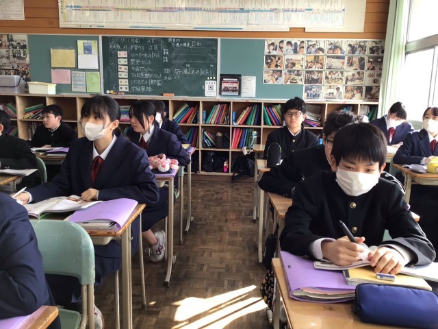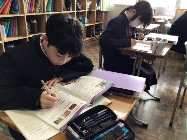 1年生は教科書本文の日本のお正月を外国の人に伝える文の学習をしています。本文の中には動詞の過去形が出てきます。動詞の過去形には原型にedをつければいいもの、不規則に変化するものがあります。一つ一つ覚えなければならないので、よりたくさんの学習が必要になります。時間を上手に使って、繰り返し学習してください。