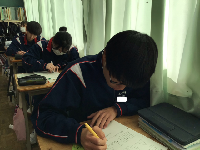 受験である3年生は理科の授業で食物連鎖の学習をしました。やはり受験生です。授業で聞き逃しがないようにメモを取り、授業の終わりには学習した事柄をプリントにまとめていました。