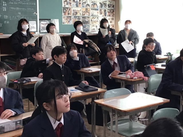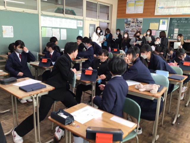 1年生の数学では、「数学パズルを解いて数学的な見方をのばそう」の課題のもと、さまざまなパズルに挑戦していました。生徒が苦戦する中、参観された保護者の方のが先に解答を導き出すなど和やかな雰囲気で授業が進んでいました。解けた生徒は数学担当教員に解答を説明していました。数学的な見方が試される授業となりました。