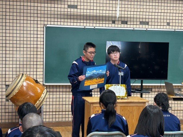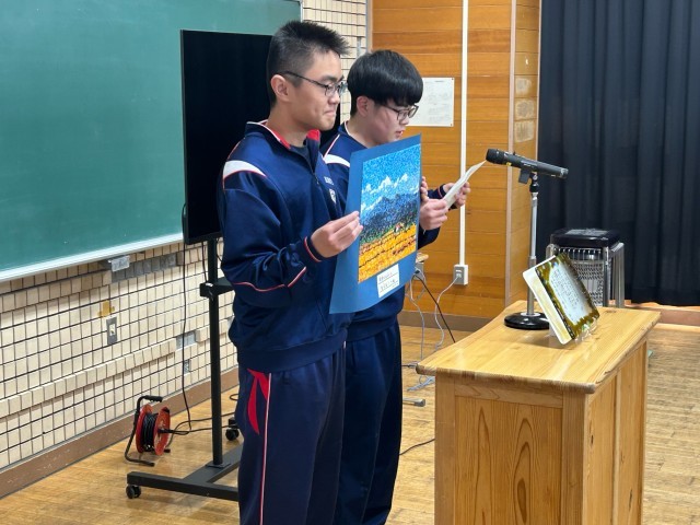郡山市のつながるアート展で大賞を受賞した、あおぞら学級の2名が全校生に受賞報告を行いました。作製するにあたって、難しかったことや受賞した喜びを堂々と発表しました。