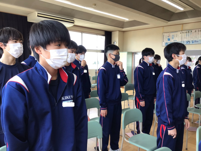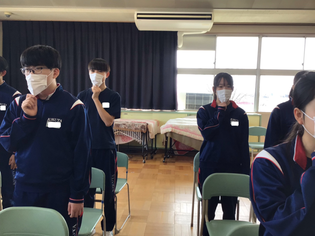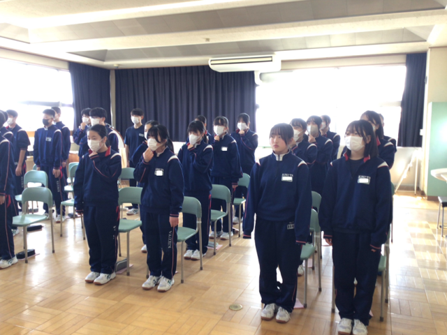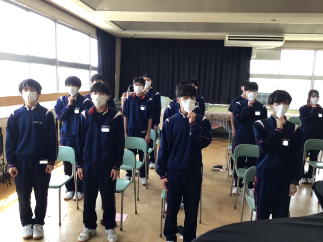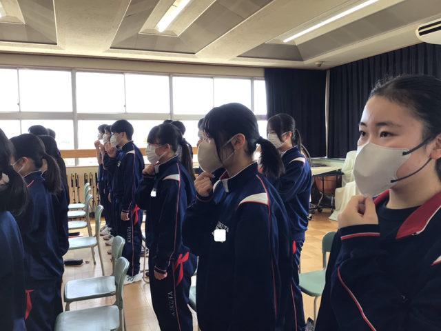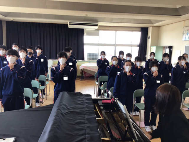 卒業式に向けての2年生の式歌練習の様子です。音楽室に響き渡る大きな声で歌っています。インフルエンザが流行しているので、マスク着用で歌いました。