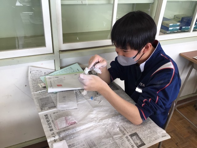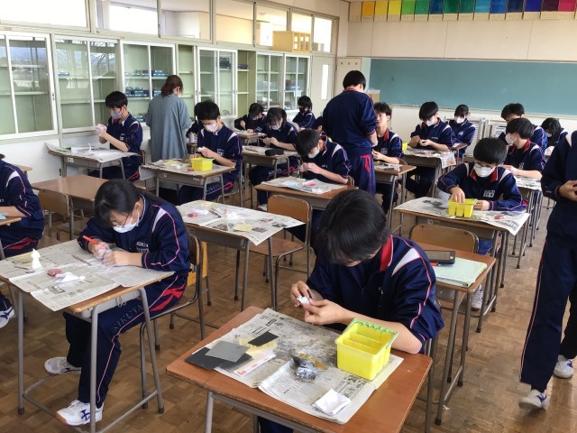 3年生の美術の授業は、今日で最後となりました。篆刻の仕上げに取り組んでいました。中には、表面がすべすべになるまで磨いた生徒もおり、思い出に残る作品のひとつとなったようです。